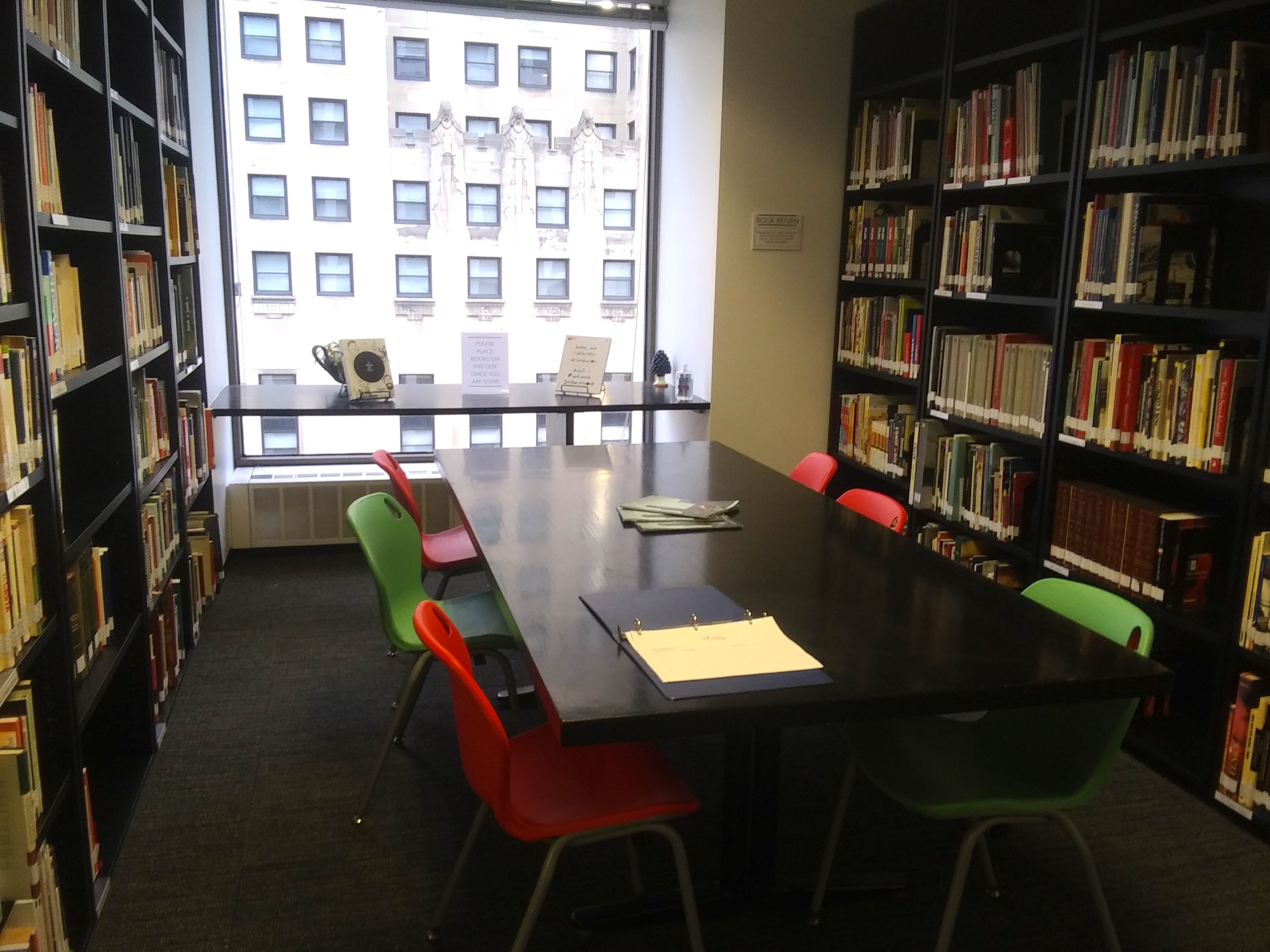 The new shelving arrangement worked out beautifully. The larger DDC 100-700s sections fit perfectly within the first reading room, where a large table offers visitors a nice place to browse the large artist monographs. The smaller 800-900s sections were placed in the second reading room where a smaller table stands.