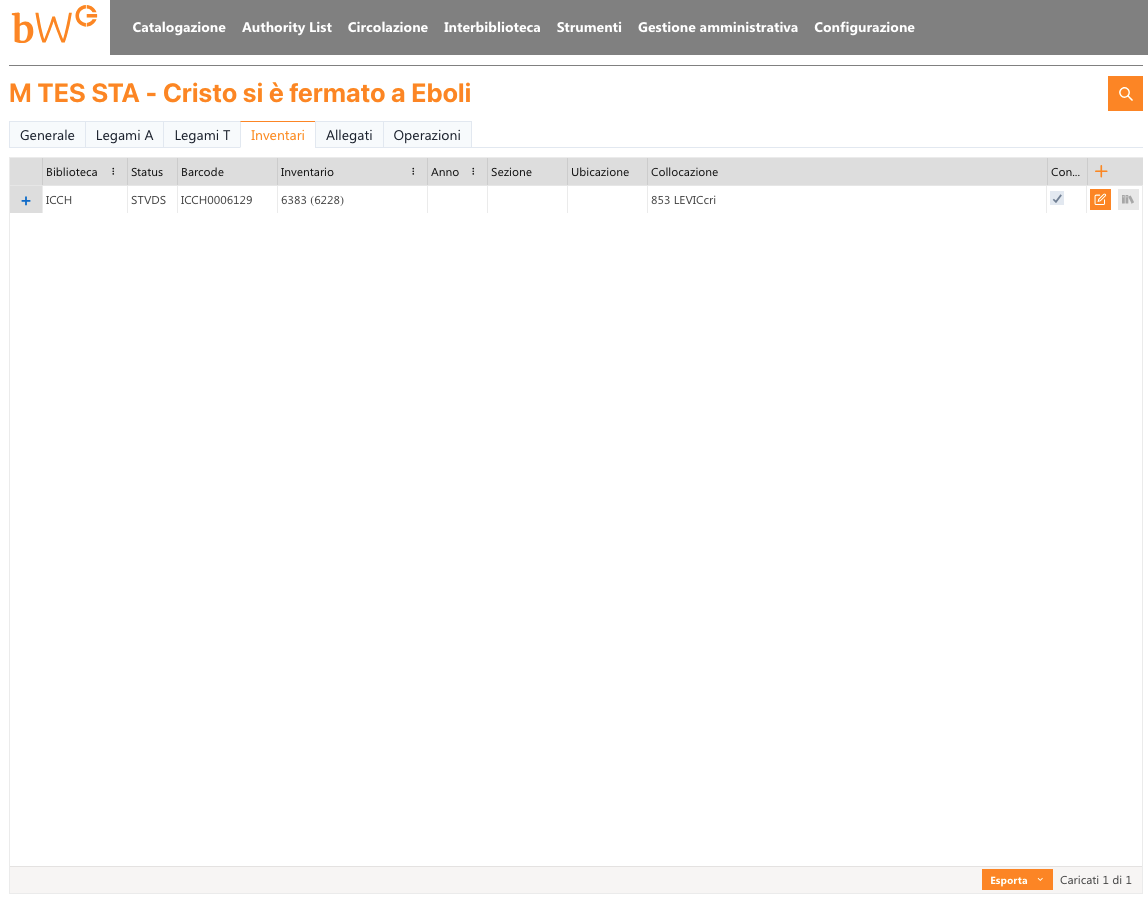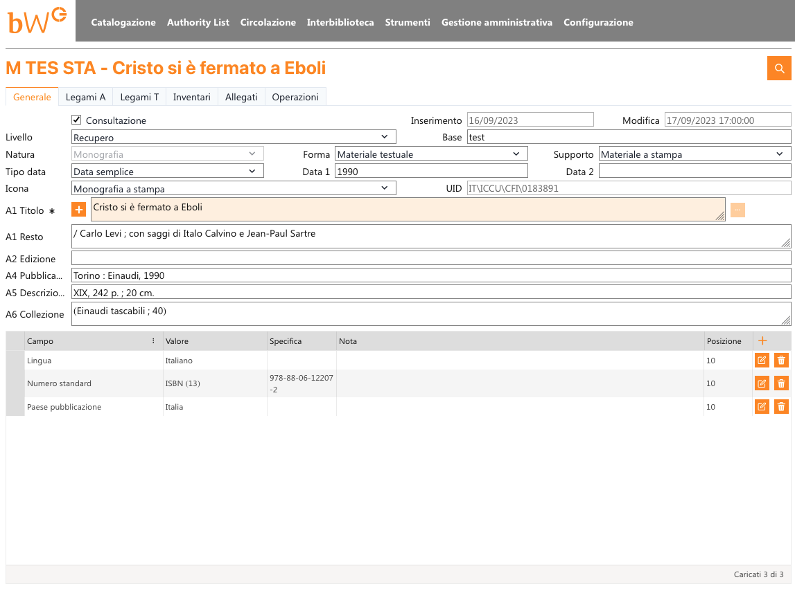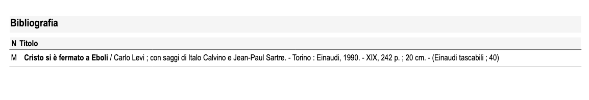 Screenshot of the ISBD record for Carlo Levi's book Cristo si è fermato a Eboli in BiblioWin