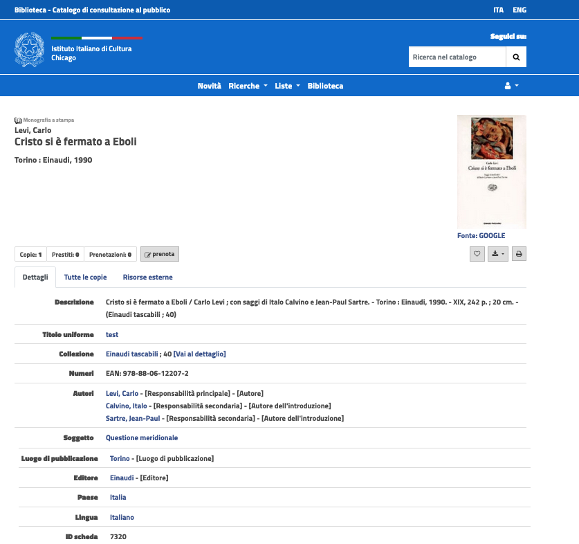 It offers connection to consortium copy-cataloging services through the SBN (il Servizio Bibliotecario Nazionale), the Italian union-catalog database.