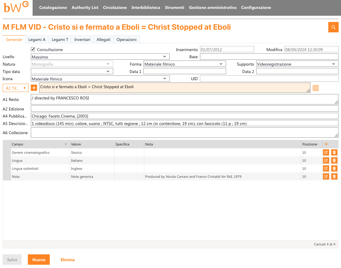 Screenshot of the Expression record for Francesco Rosi's film adaptation of Cristo si è fermato a Eboli, based on Carlo Levi's book, in BiblioWin