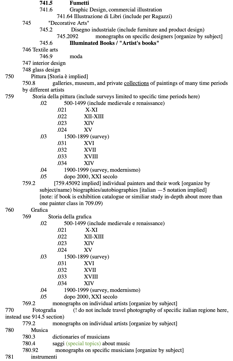 While I was building the schema, I made instructional notes for IIC Library's specific use, based on many conversations with IIC's Director. For example, the Director requested that art photography books would go into 770—unless they were prodominently featured travel photography and documented specific regions in Italy, those would go in 914.5 under specific geographic regional section next to travel-guide books (thereby better facilitating users who were studying or making travel plans to visit particular regions).